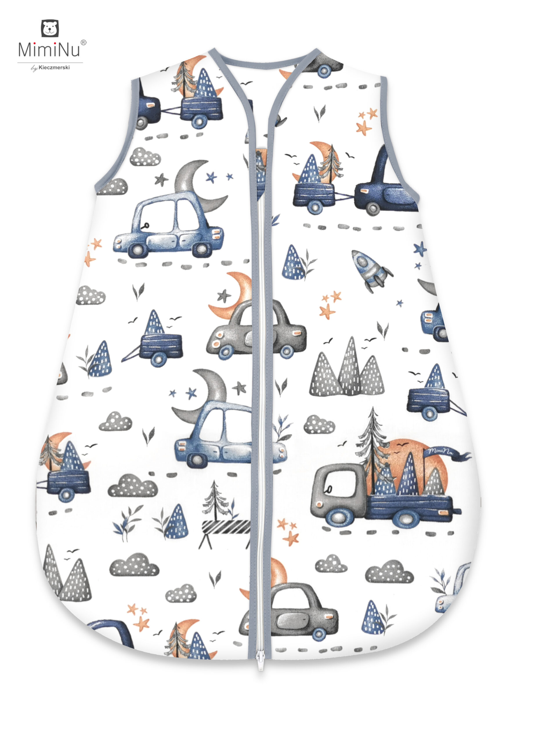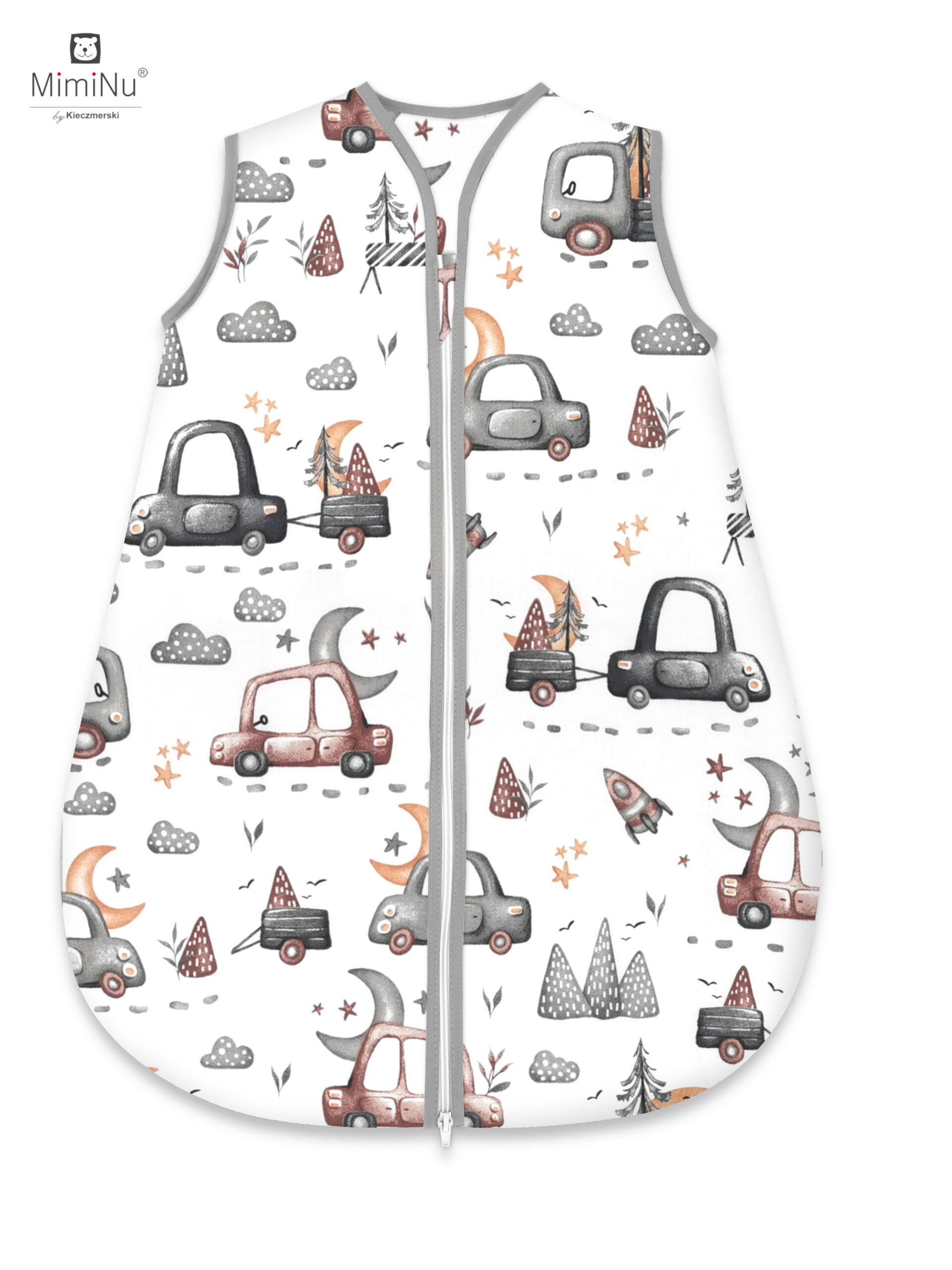 ŚPIWOREK AVI CAŁOROCZNY ROZMIAR 74CM, BAWEŁNA 100% MIMINU DESIGN SAMOCHODY SZARE