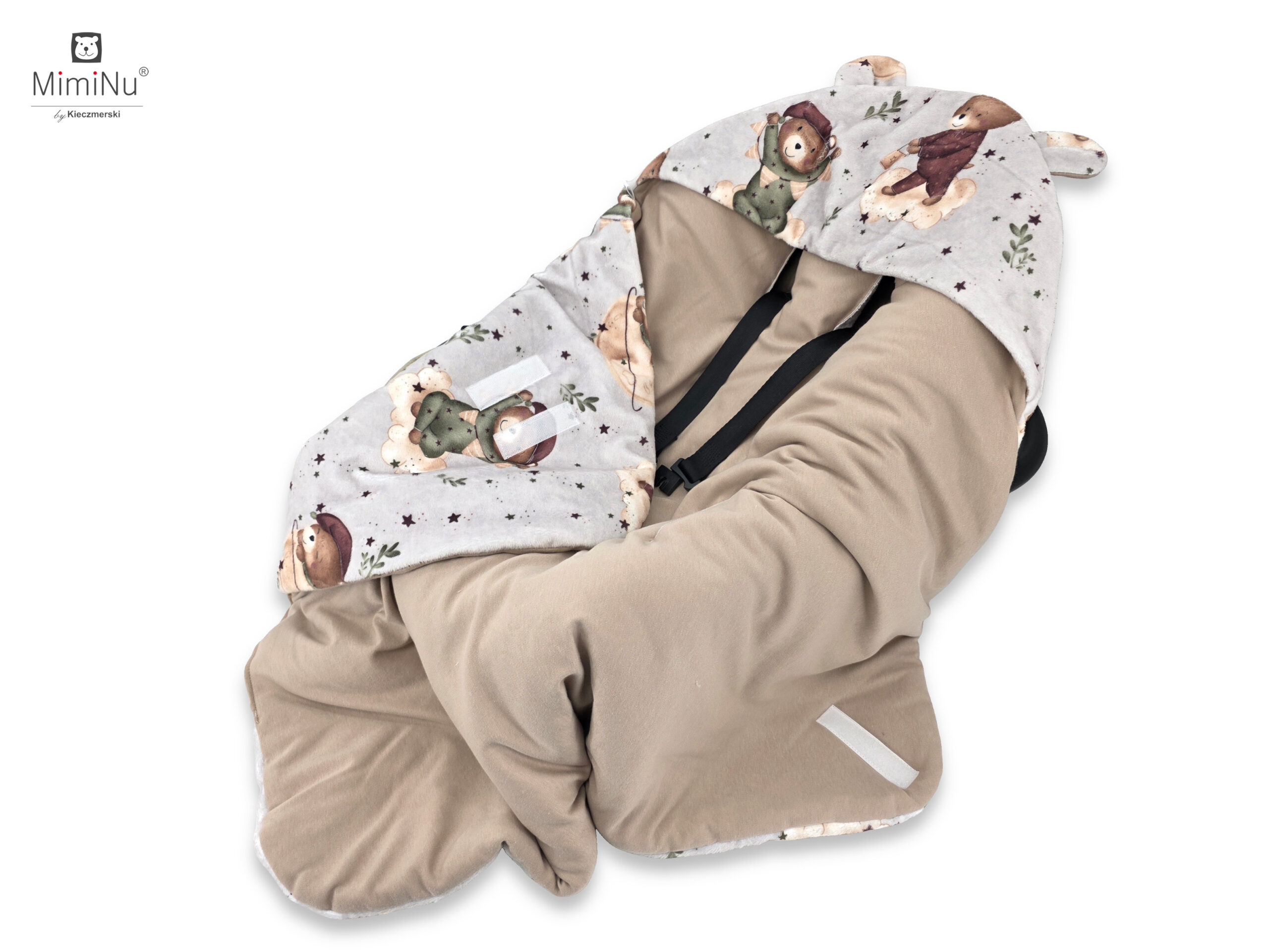 NEW MINKY DRUKOWANE + INTERLOCK - OTULAK/KOCYK OCIEPLANY DO WÓZKA, FOTELIKA SAMOCHODOWEGO Z KAPTURKIEM - MIŚ NA KSIEŻYCU + BEŻ