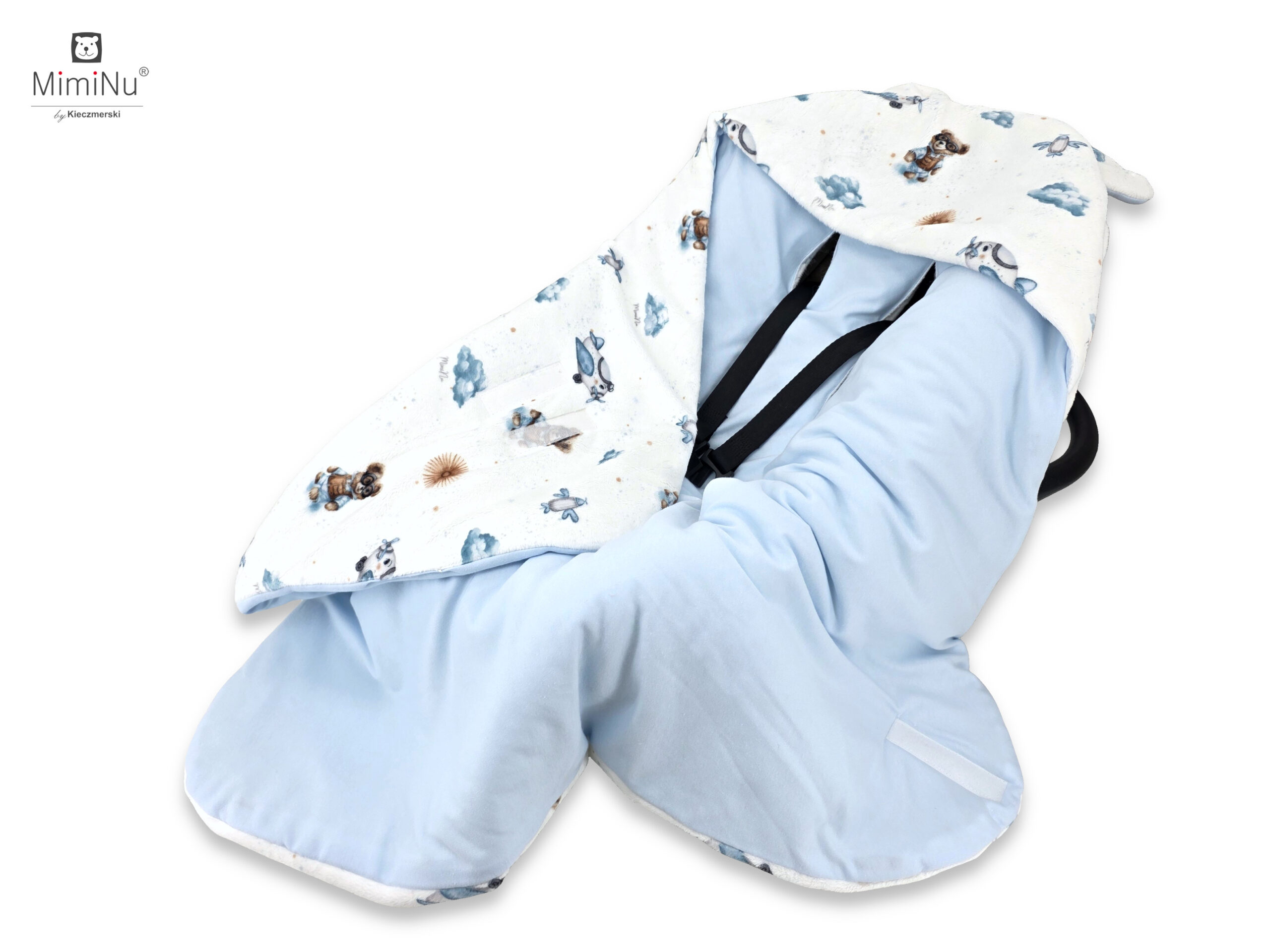 NEW MINKY DRUKOWANE + INTERLOCK - OTULAK/KOCYK OCIEPLANY DO WÓZKA, FOTELIKA SAMOCHODOWEGO Z KAPTURKIEM - MISIE BŁĘKIT + BŁĘKIT