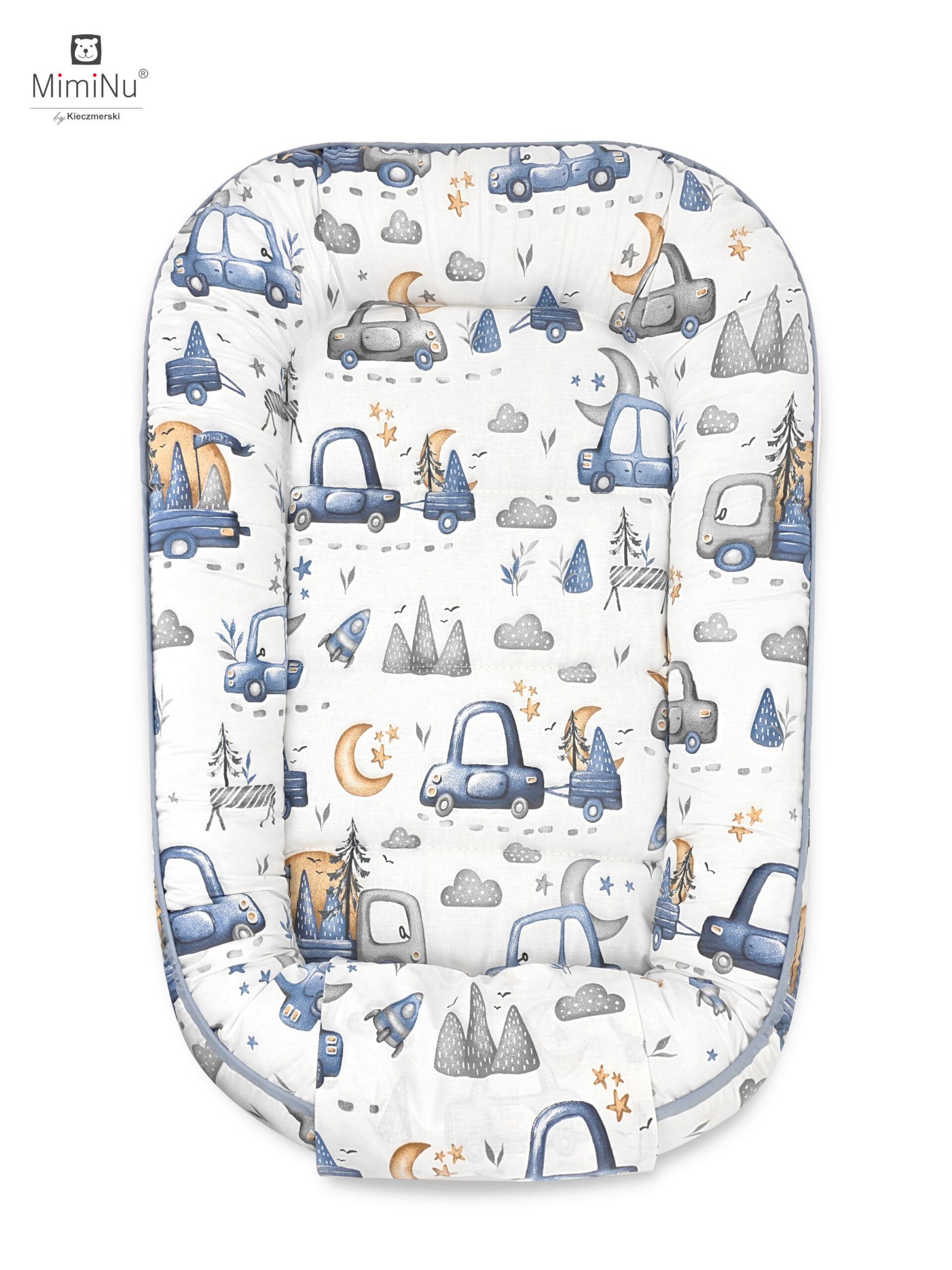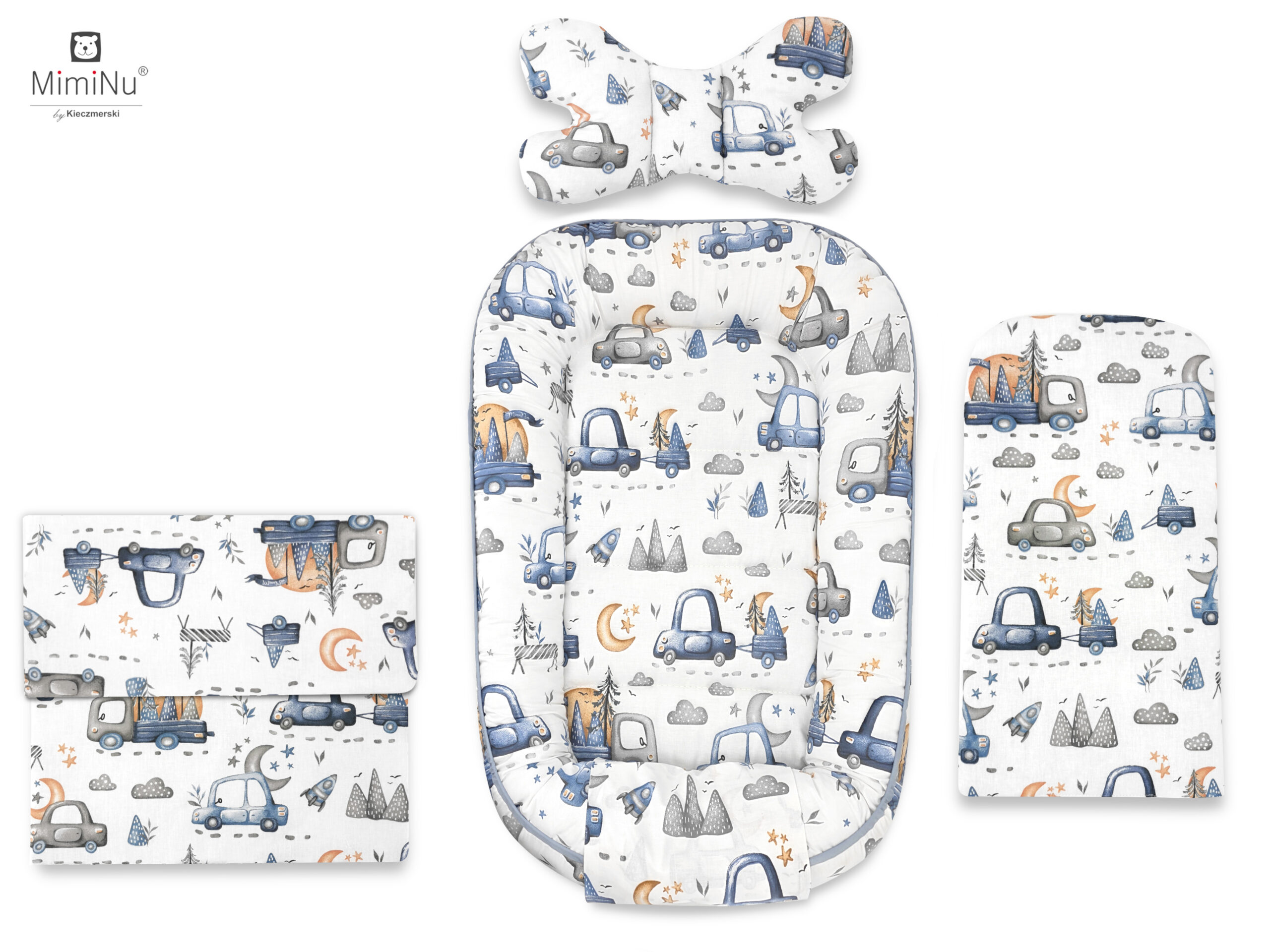 4 ELEMENTOWY ZESTAW: KOKON NIEMOWLĘCY, MATERACYK, KOŁDERKA + PODUSZECZKA MOTYLEK - BAWEŁNA 100% MIMINU DESIGN SAMOCHODZIKI NIEBIESKIE
