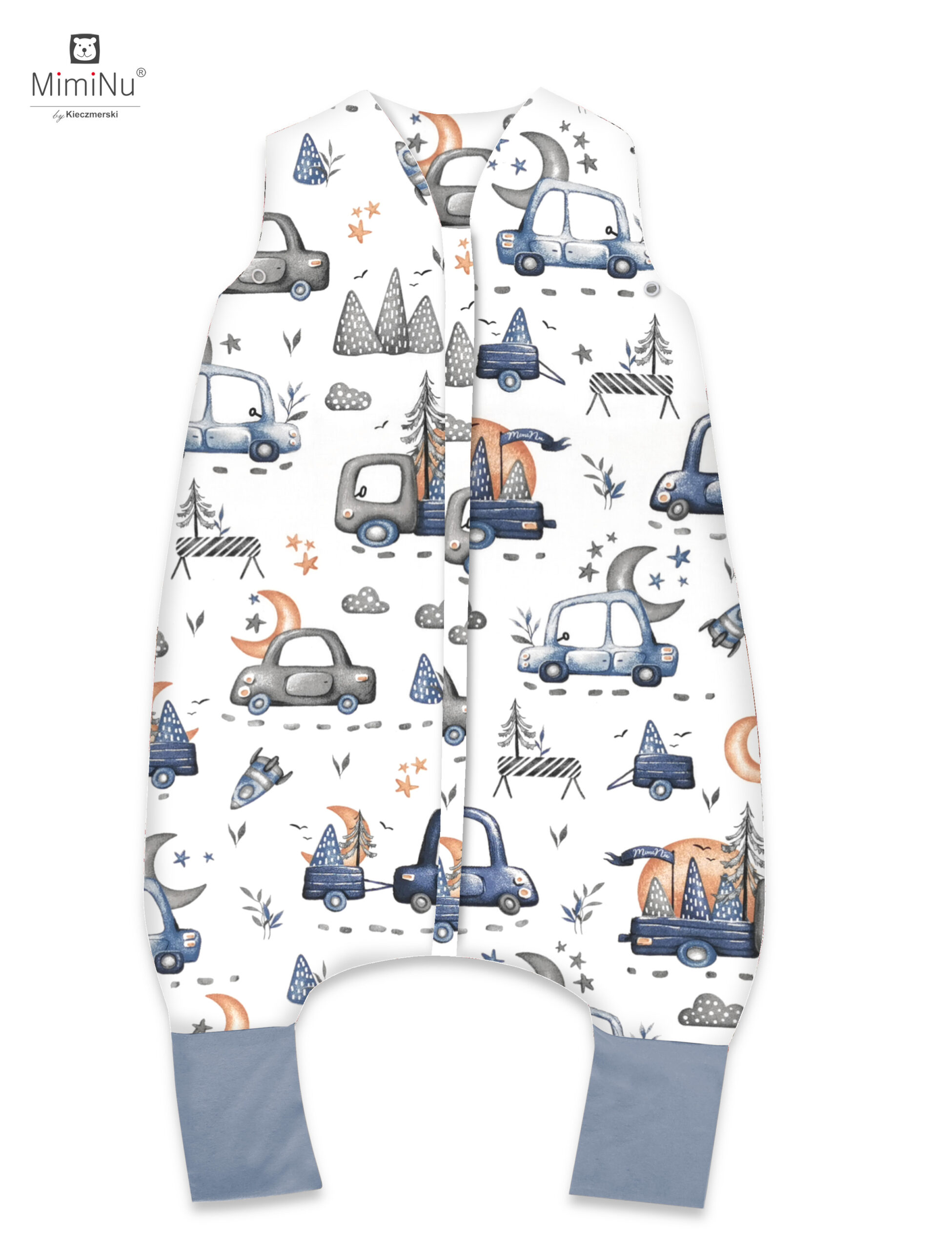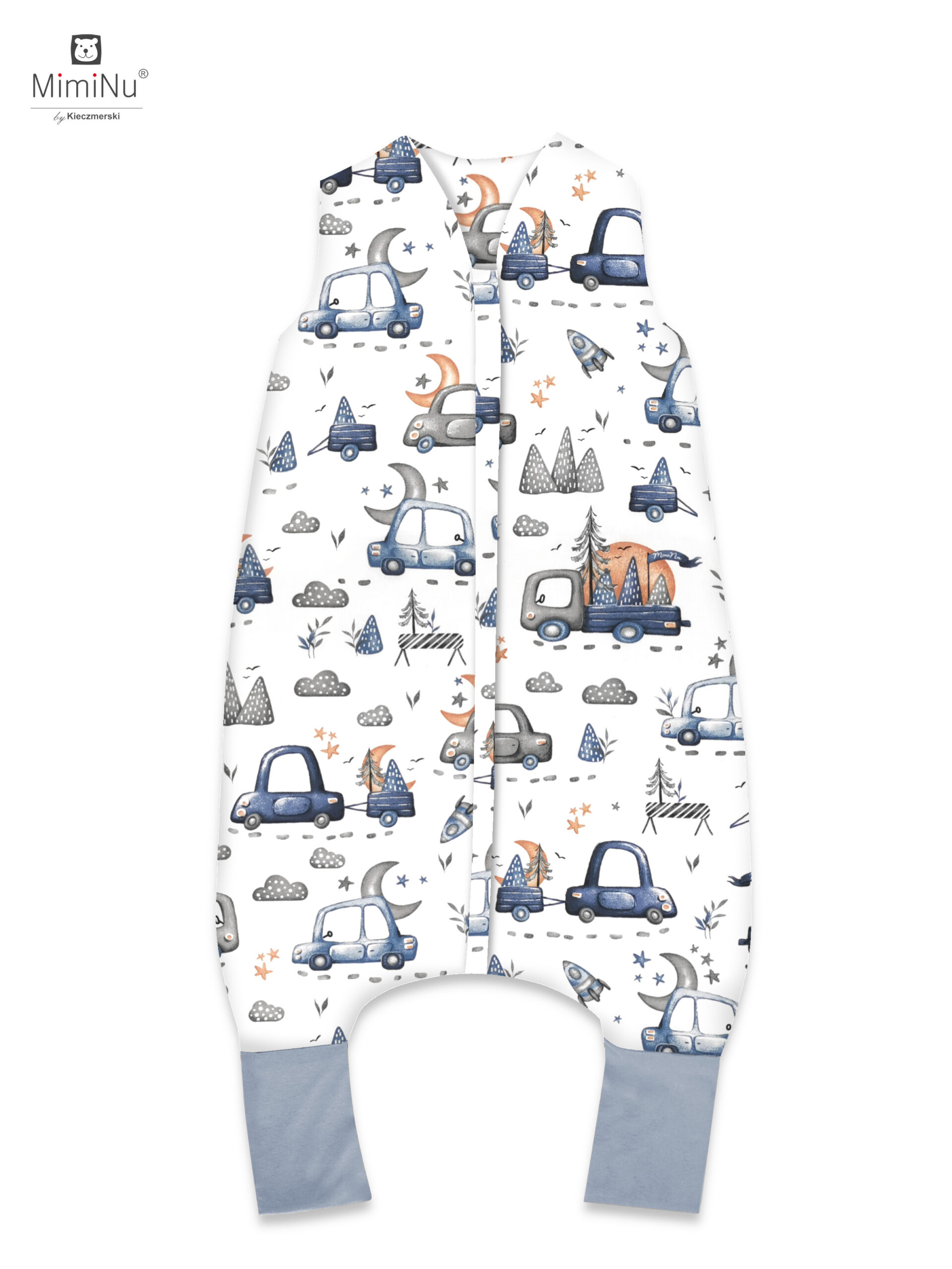 MIMINU DESIGN SAMOCHODZIKI NIEBIESKIE - ŚPIWOREK DO SPANIA Z NOGAWKAMI CAŁOROCZNY ROZMIAR S BAWEŁNA 100%