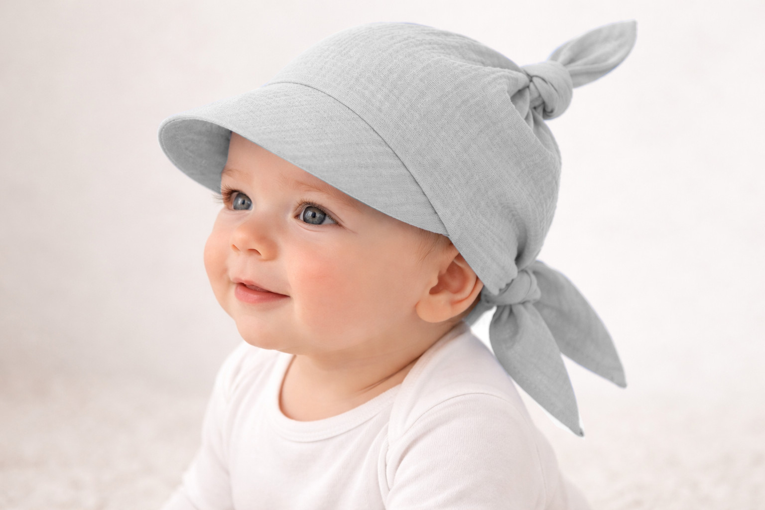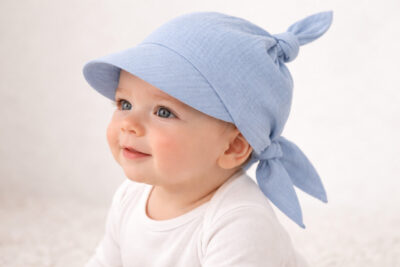 Uniwersalna chustka z daszkiem, która dzięki supełkowym wiązaniom z tyłu oraz u góry ma sporą możliwość regulacji. Idealnie sprawdza się już od pierwszych miesięcy życia, aż po lata przedszkolne, dla dzieci w wieku 3 miesiące - 4 lata. Chustka chroni oczy i główkę maluszka przed słońcem. Wykonana z muślinu bawełnianego, to najwyższej jakości dzianina bawełniana, dzięki czemu jest przewiewna i doskonale sprawdzi się latem. Daszek można ustawić na prosto lub podnieść do góry, w zależności od potrzeby w danej chwili.