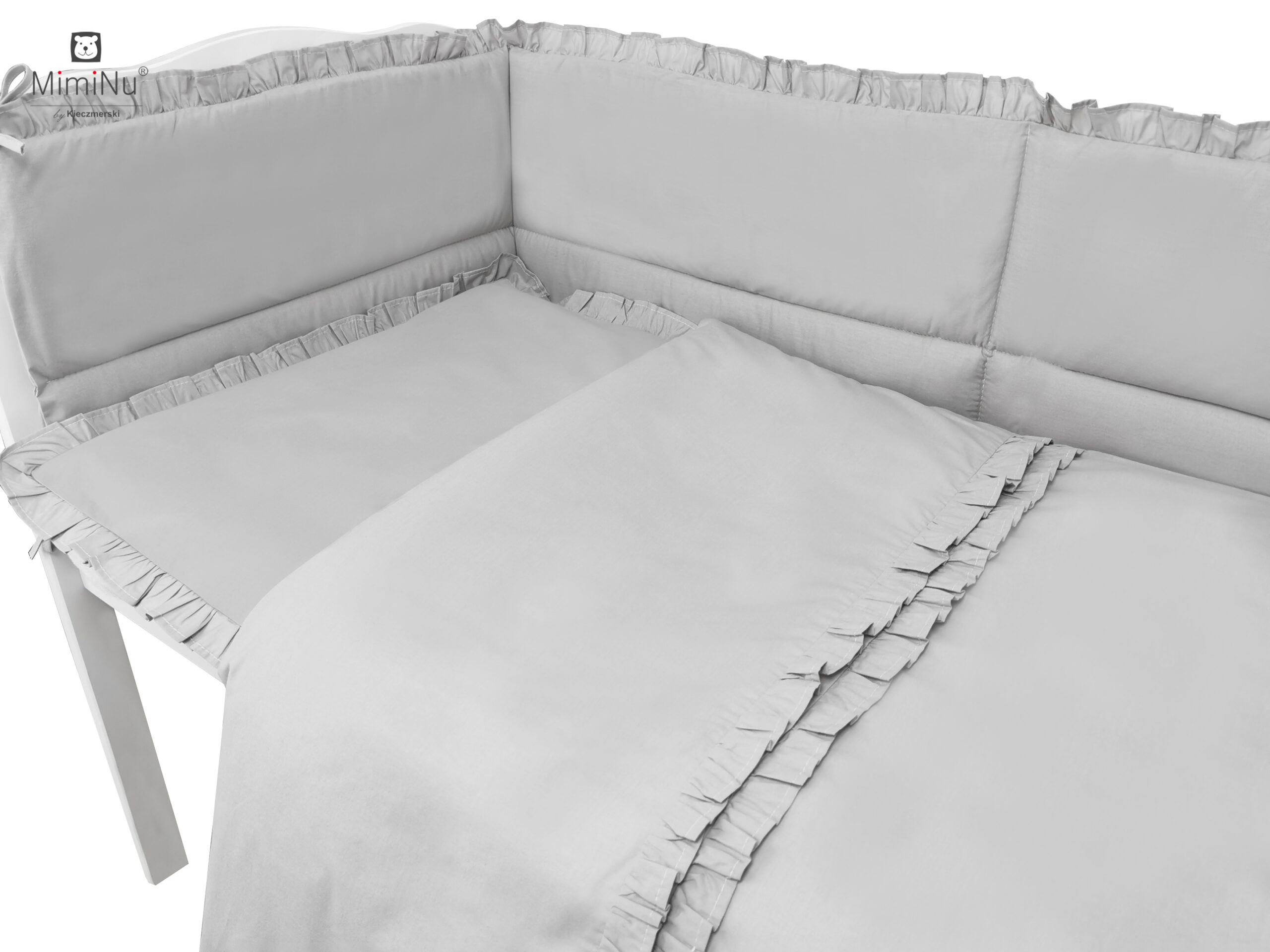 A truly royal cotton bedding set for babies and children. Around the pillowcase, on the front of the duvet cover and on top of the protector are decorative frills, which add charm to the simple, smooth bedding. The bedding is extremely subtle and elegant, created by hand with great care. Subdued colours will make the bedclothes perfectly fit into the most sophisticated decor of a child's room, completing it. Every, even the most demanding parent, will be delighted with the quality of the fabric and workmanship of the bedclothes. The exceptional softness of cotton favours relaxation and makes the child's sleep pleasant.