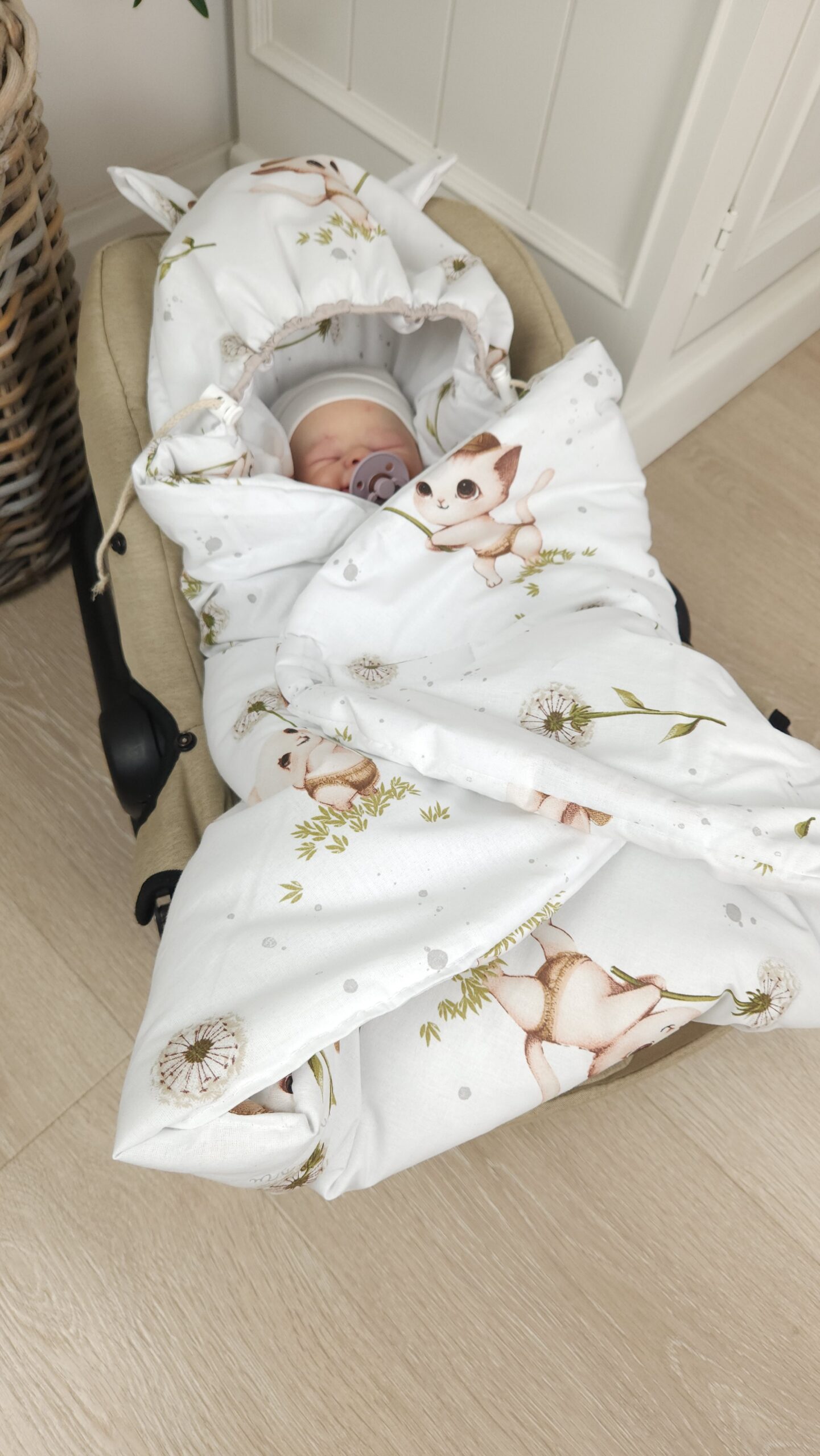 MIMINU DESIGN KOTKI - OTULAK/KOCYK DO WÓZKA, FOTELIKA SAMOCHODOWEGO Z KAPTURKIEM OCIEPLANY BAWEŁNA 100%