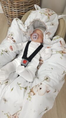 Otulak posiada otwory na 5 punktowe pasy bezpieczeństwa, czyli pasuje do zdecydowanej większości modeli fotelików samochodowych czy wózków.