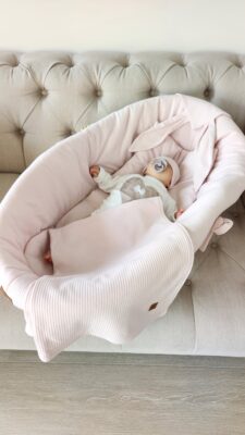 Wypełnienie boków włókniną poliestrową zapewnia bezpieczeństwo, komfort oraz minimalizuje ryzyko uderzenia. Dodatkowo wszyta guma umożliwia dopasowanie obwodu wkładu do każdej gondoli wózka czy kosza Mojżesza, dzięki czemu ochraniacz jest stabilnie zamocowany. Poduszeczka i materacyk i kocyk idealnie uzupełniają zestaw tworząc piękną całość.