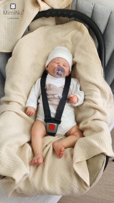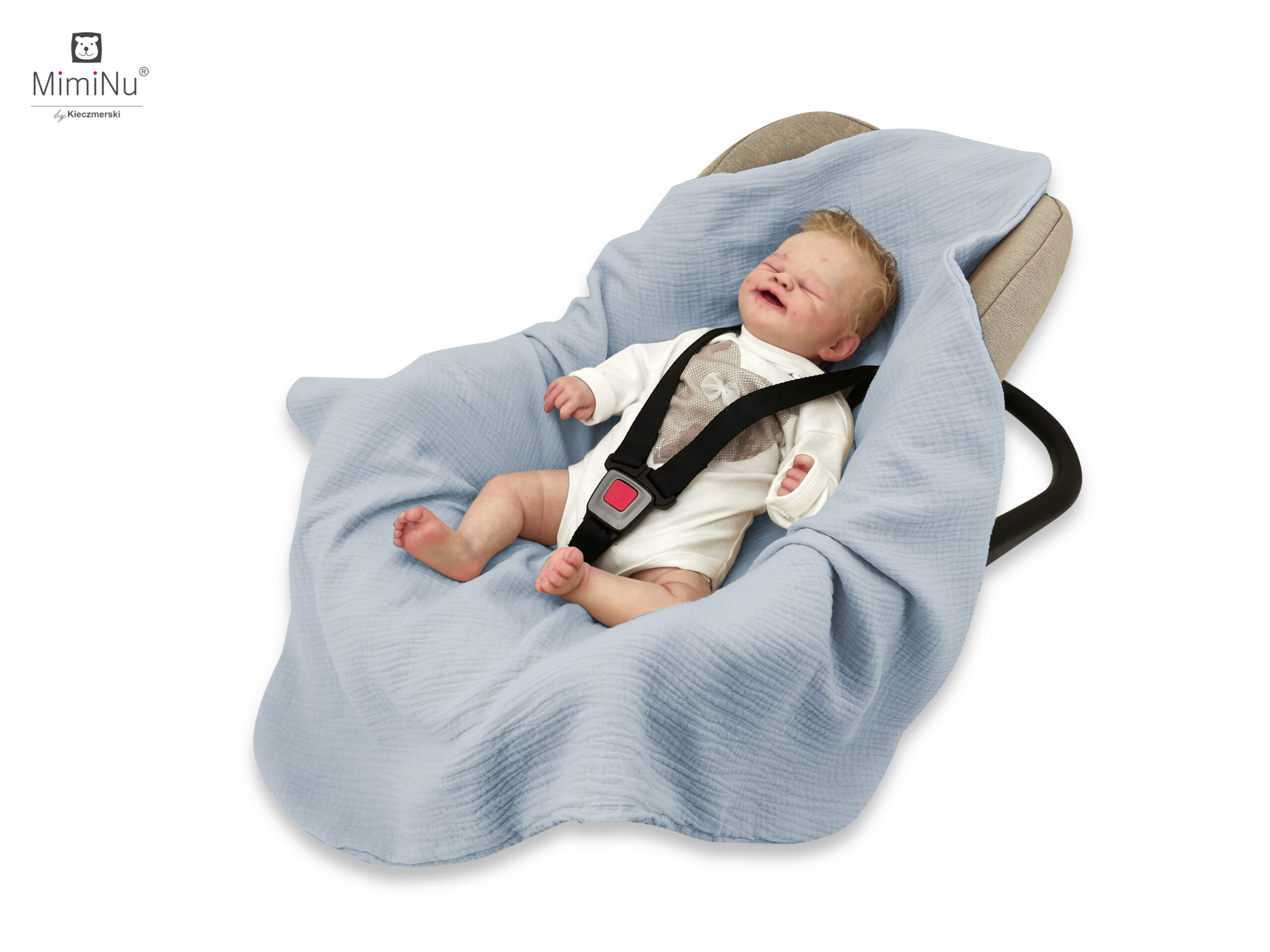 Kocyk ma otwory na każdy rodzaj pasów (nosidełko, wózek, fotelik, krzesełko). Kocyk uszyty jest z 2 warstw puszystego i lekkiego muślinu.