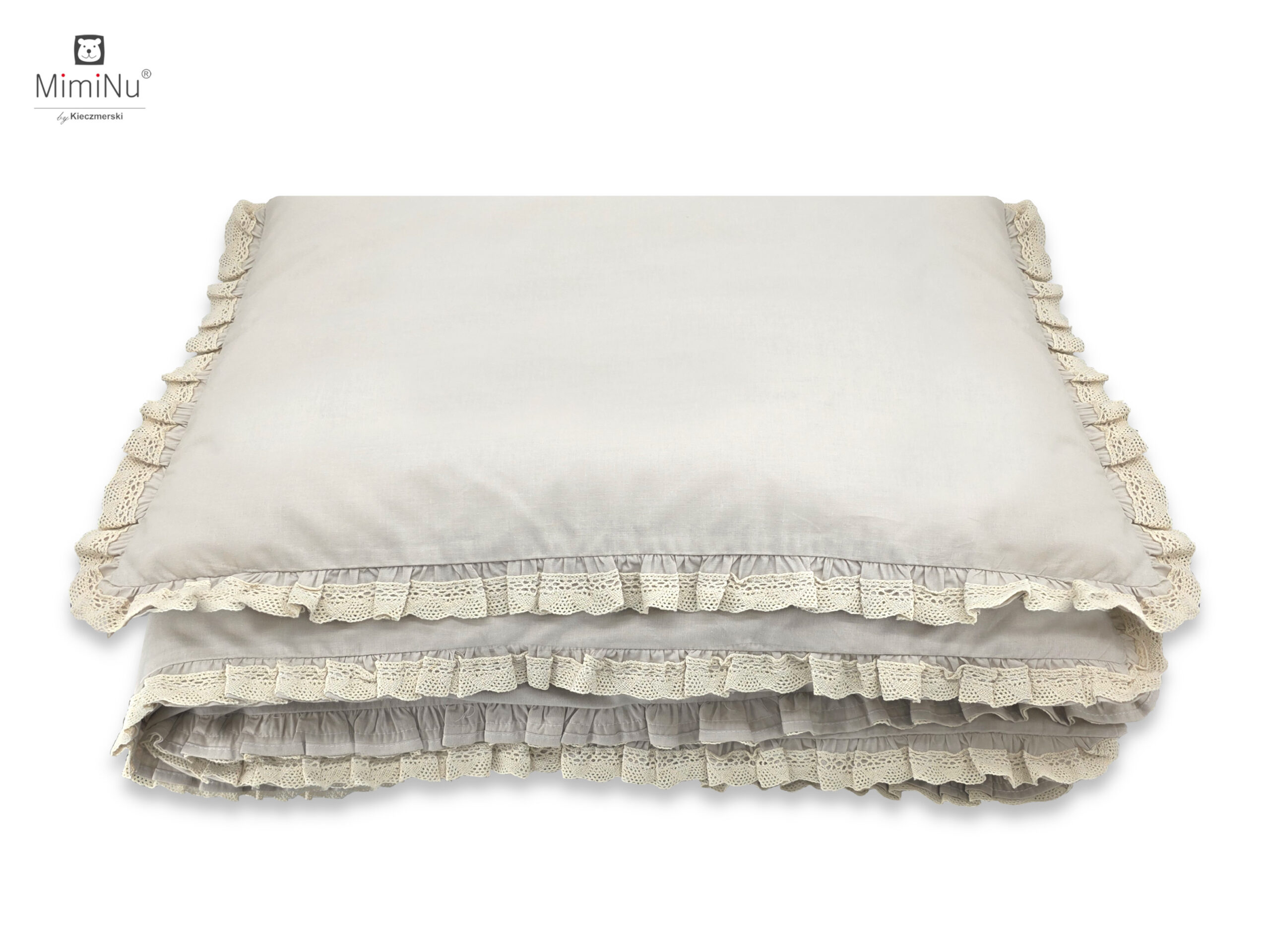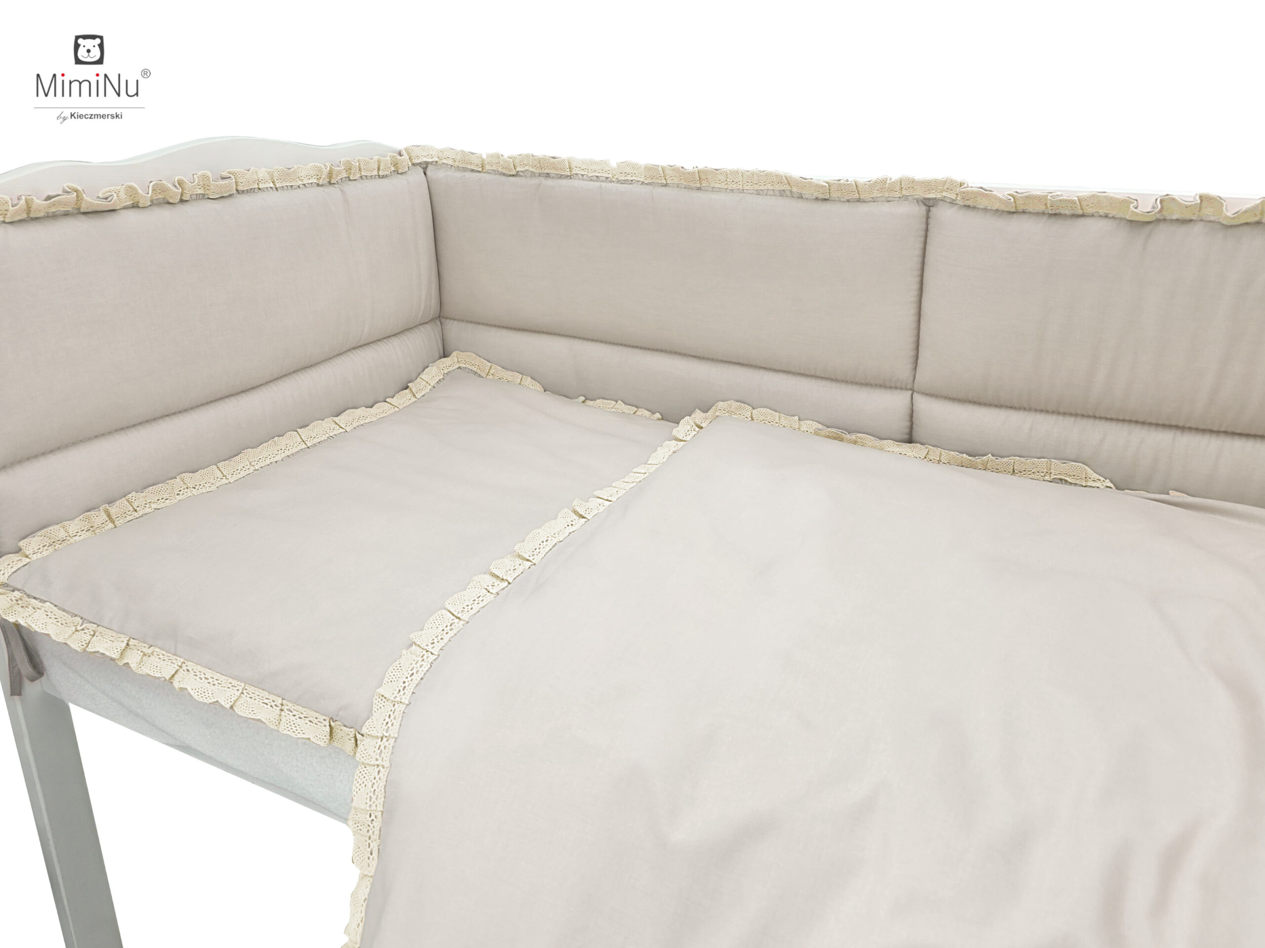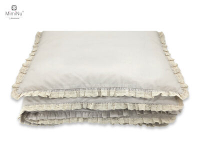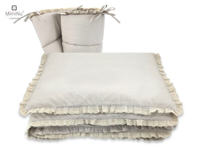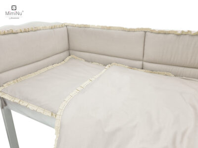 Stwórz wyjątkowo przytulne i eleganckie miejsce do snu dla swojego maluszka dzięki tej uroczej pościeli z kolekcji MimiNu. Zestaw został uszyty z wysokogatunkowej 100% bawełny, delikatnej i bezpiecznej dla wrażliwej skóry dziecka. Gładka pastelowa kolorystyka w połączeniu z koronką i falbanką nadaje całości klasyczny, romantyczny charakter.