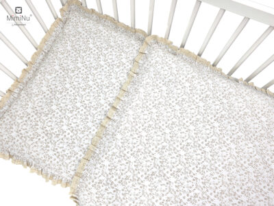 Stwórz wyjątkowo przytulne i eleganckie miejsce do snu dla swojego maluszka dzięki tej uroczej pościeli z kolekcji MimiNu. Zestaw został uszyty z wysokogatunkowej 100% bawełny, delikatnej i bezpiecznej dla wrażliwej skóry dziecka. Subtelny wzór drobnych kwiatuszków w połączeniu z koronką i falbanką nadaje całości klasyczny, romantyczny charakter.